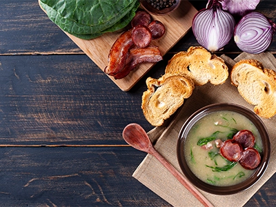 Caldo Verde, a popular local dish, may appear to the uninitiated as cabbage soup. It is deceptively difficult to make because the greens are cut in very specific ways, absorbing much of the faint smoky flavour imparted by the addition of barbequed sausage.